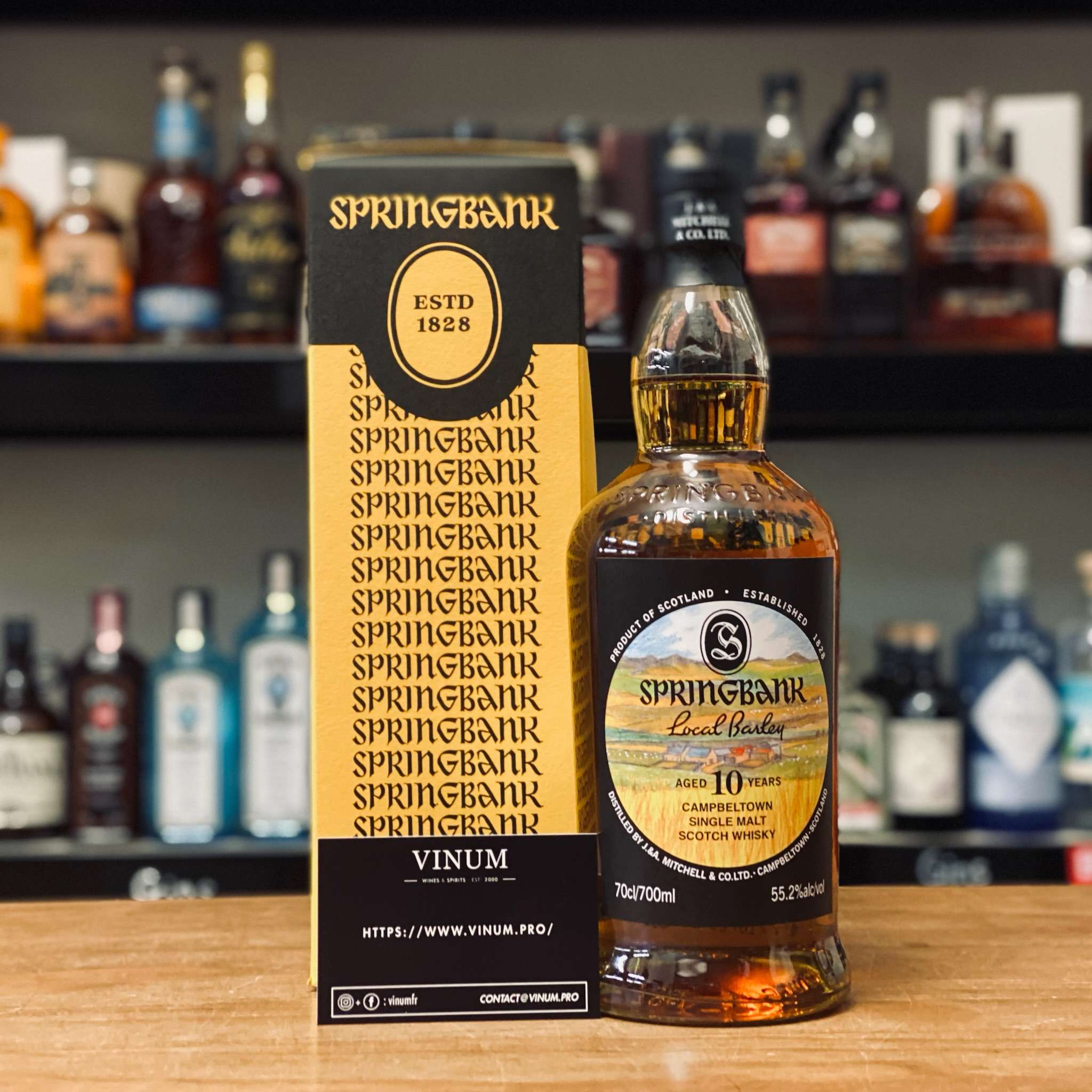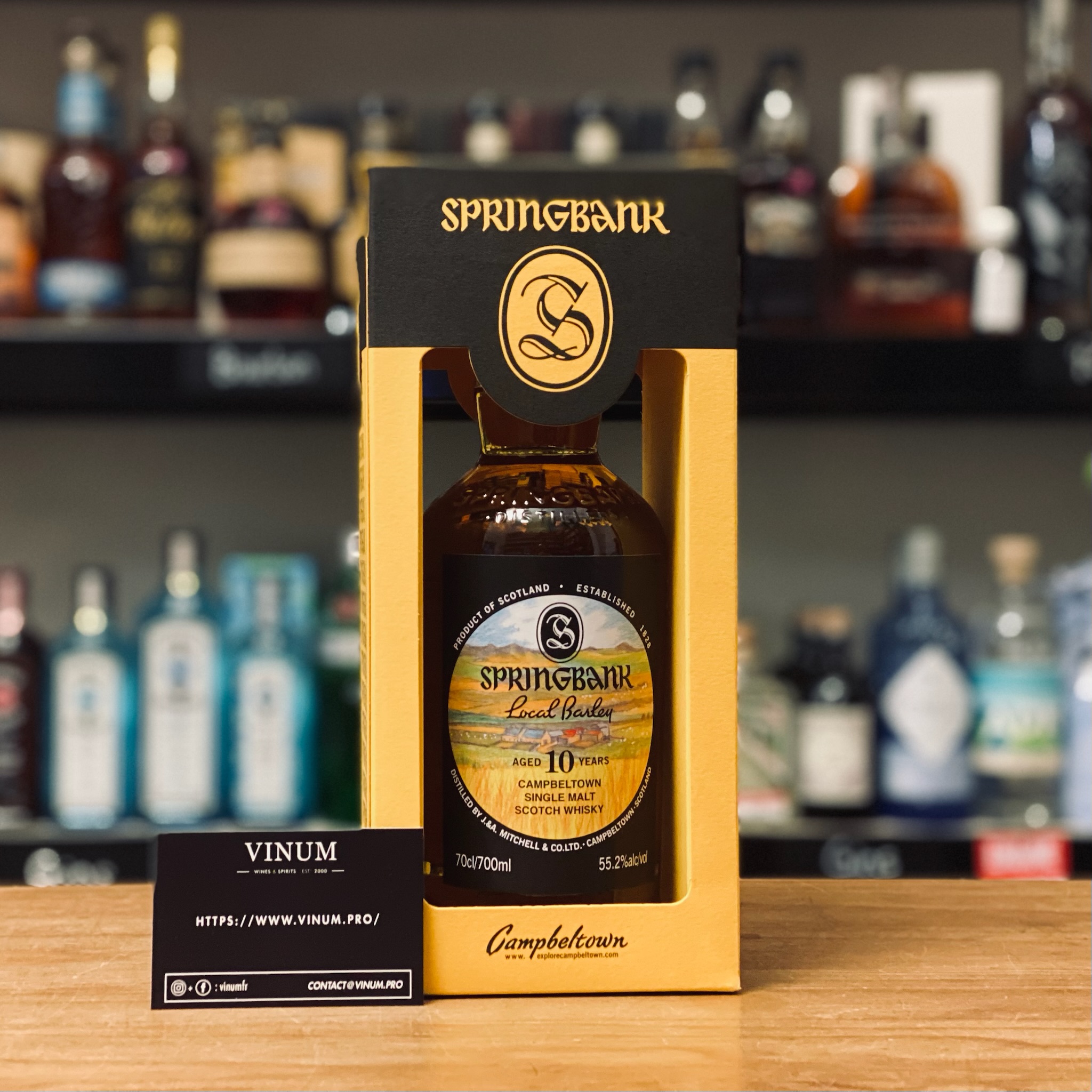 Le Springbank Local Barley 10 ans est un single maltD'après la Scotch Whisky Association, « le single malt est le produit d'une distillerie de malt ». En d'autres termes, le single malt est un whisky pur malt (élaboré à partir de 100% d'orge maltée) provenant d'une seule distillerie. Concrètement, un single malt résulte de l'assemblage de dizaines de fûts de nature et d'âge différents. C'est le plus jeune whisky entrant dans le mélange qui donne son âge au single malt, et, à quelques exceptions près, c'est la distillerie qui donne son nom au whisky. More écossais produit par la distillerie Springbank, une maison emblématique de Campbeltown réputée pour son attachement aux méthodes traditionnelles. Cette cuvéeVin provenant d'une cuve déterminée. Dans la pratique, le vigneron choisit et isole un volume de vin pour son caractère spécifique. Il est courant de donner un nom à une cuvée. More est élaborée exclusivement à partir d’orge cultivée localement, ce qui lui confère une identité directement liée à son terroirUn terroir est un ensemble de vignobles d'une même région et d'une même appellation, partageant le même type de sol et de conditions climatiques, qui contribuent à donner au vin une spécificité unique. More d’origine. Springbank utilise un processus de production très artisanal, comprenant une maltage partiel sur place, une distillationQuatrième étape de l'élaboration, la distillation consiste à extraire l'alcool du wash (moût fermenté) par chauffage et condensation successifs. En Ecosse, le whisky résulte le plus souvent d'une double distillation dans des alambics pot stills. La triple distillation dans des alambics pot stills se pratique en Irlande. Toutefois certains Irish whiskeys ne sont distillés que deux fois tandis que d'autres le sont jusqu'à cinq fois. Enfin aux Etats-Unis, le straight whiskey subit une double distillation. La première s'effectue dans un alambic en continu appelé beer still, la seconde dans un alambic pot still de type doubler ou thumper. More lente et un vieillissement en fûts de chêne soigneusement sélectionnés.