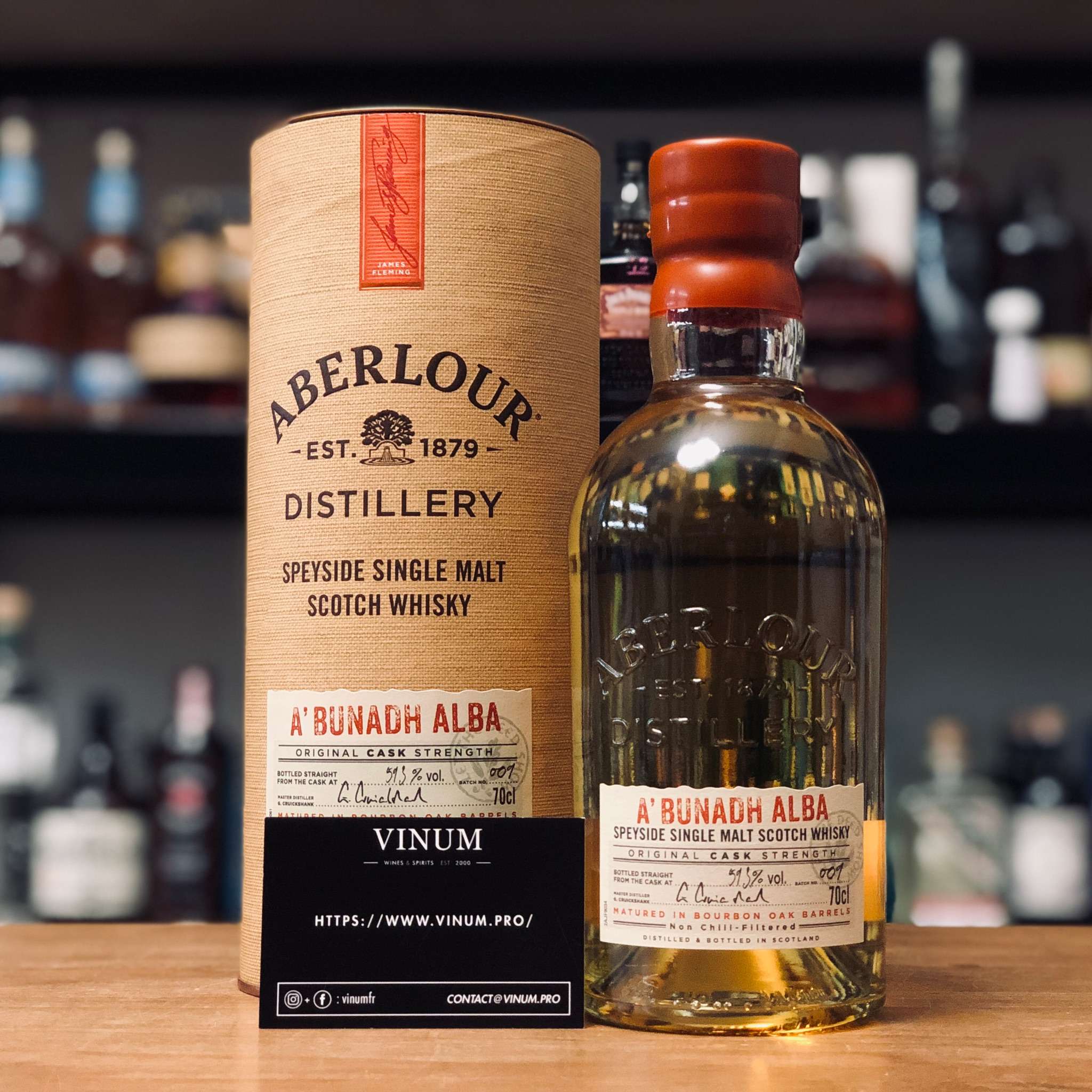 L’Aberlour A’Bunadh Alba est un single maltD'après la Scotch Whisky Association, « le single malt est le produit d'une distillerie de malt ». En d'autres termes, le single malt est un whisky pur malt (élaboré à partir de 100% d'orge maltée) provenant d'une seule distillerie. Concrètement, un single malt résulte de l'assemblage de dizaines de fûts de nature et d'âge différents. C'est le plus jeune whisky entrant dans le mélange qui donne son âge au single malt, et, à quelques exceptions près, c'est la distillerie qui donne son nom au whisky. More écossais du SpeysideLe Speyside regroupe plus des deux tiers des distilleries d'Ecosse. C'est le triangle d'or" du whisky dont l'extrémité sud aboutit aux Monts Cairngorm et dont la base qui s'appuie sur le golfe du Moray est délimitée par deux rivières, à l'ouest la Findhorn et à l'est la Deveron. C'est une autre rivière la Spey qui lui a donné son nom. C'est dans ses affluents la Fiddich, la Livet ou l'Avon que la plupart des distilleries de la région puisent leur eau. La présence de nombreux cours d'eau et le climat tempéré en font une région naturellement fertile, idéale pour la culture de l'orge. Les montagnes qui l'entourent constituaient un rempart naturel pour les distillateurs clandestins. Il n'est donc pas étonnant que tant de distilleries y aient trouvé refuge. Les malts du Speyside sont généralement doux avec des arômes caractéristiques de fruits (la poire, la pomme) et de fleurs. More élaboré par la distillerie Aberlour. Cette expression s’inscrit dans la continuité de la gamme A’Bunadh, tout en s’en distinguant par un élevage exclusivement réalisé en fûts de chêne américain ex-bourbon. Il est embouteillé brut de fût, sans filtration à froidProcédé consistant à refroidir un spiritueux avant filtration pour éviter les troubles visuels. More, avec un degré élevé variant selon les batchs, généralement autour de 60 % vol..