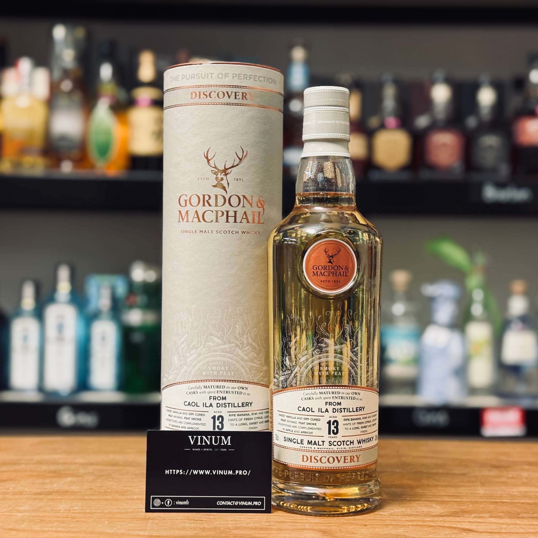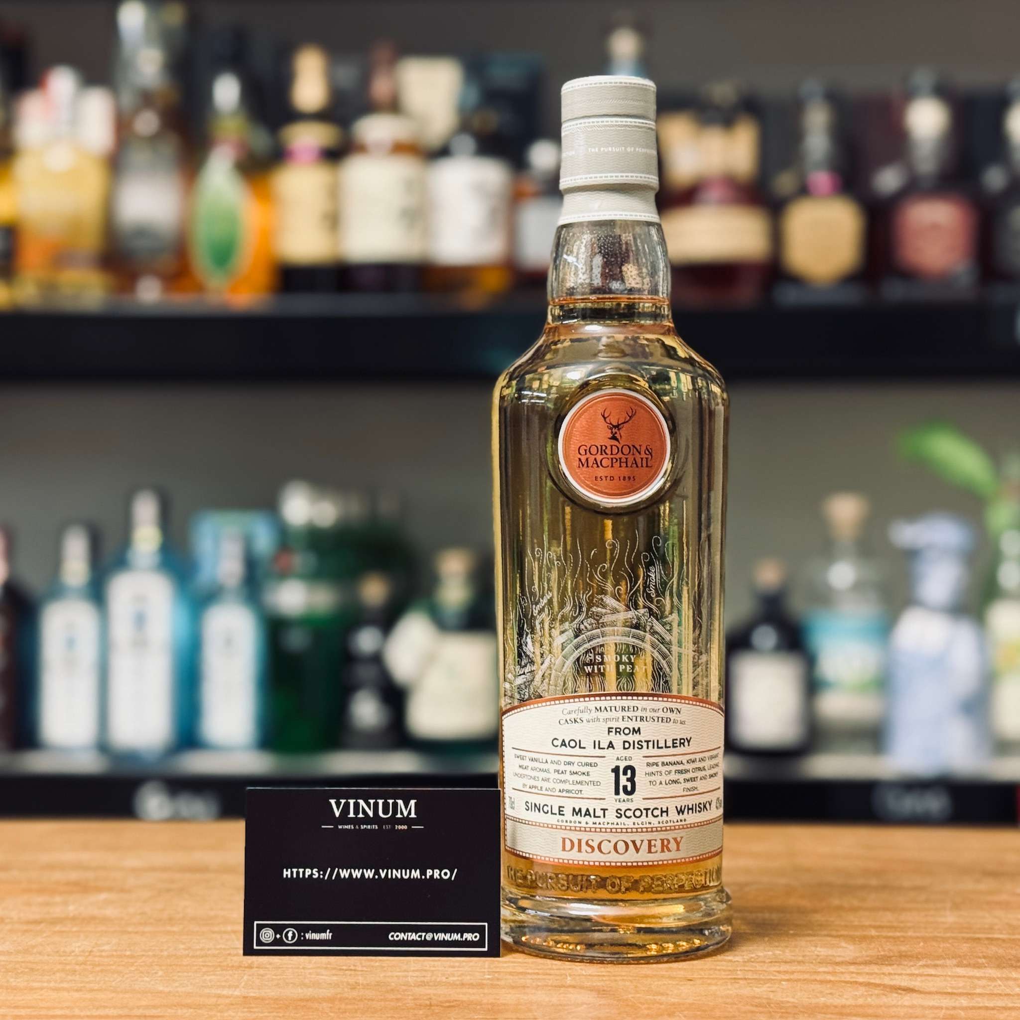 Le Caol Ila 13 ans Gordon & MacPhail Discovery “Smoky” est un whiskyTerme générique désignant tous les whiskies produits en Ecosse, au Canada, au Japon et plus exceptionnellement aux Etats-Unis. L'origine gaélique du mot whisky est Uisge Beatha. More single maltD'après la Scotch Whisky Association, « le single malt est le produit d'une distillerie de malt ». En d'autres termes, le single malt est un whisky pur malt (élaboré à partir de 100% d'orge maltée) provenant d'une seule distillerie. Concrètement, un single malt résulte de l'assemblage de dizaines de fûts de nature et d'âge différents. C'est le plus jeune whisky entrant dans le mélange qui donne son âge au single malt, et, à quelques exceptions près, c'est la distillerie qui donne son nom au whisky. More écossais originaire de l’île d’IslaySituée au sud de l'île du Jura, Islay constitue une région à part entière et un lieu unique dans le monde du whisky. Balayées par les embruns marins elle est recouverte sur un quart de sa superficie de tourbières. Cette île, plus ensoleillée que la moyenne, possède également des terres fertiles propices à la culture de l'orge. Les distilleries ont su s'adapter à ses conditions climatiques et géologiques. La tourbe fut adoptée pour sécher le malt. Quant au caractère marin, il se retrouve nettement dans le style de ses whiskies: Ardbeg, Bowmore, Bruichladdich, Bunnahabhain, Caol Ila, Lagavulin, Laphroaig et Port Ellen (fermée en 1983). More et embouteillé par le négociant indépendant Gordon & MacPhail. Il a été vieilli pendant treize ans avant d’être mis en bouteille à 43 % d’alcool. Cette expression fait partie de la gamme Discovery, qui met en avant différents styles de whiskyTerme générique désignant tous les whiskies produits en Ecosse, au Canada, au Japon et plus exceptionnellement aux Etats-Unis. L'origine gaélique du mot whisky est Uisge Beatha. More. Dans cette version, le profil « Smoky » souligne le caractère tourbé et fumé typique des whiskies d’IslaySituée au sud de l'île du Jura, Islay constitue une région à part entière et un lieu unique dans le monde du whisky. Balayées par les embruns marins elle est recouverte sur un quart de sa superficie de tourbières. Cette île, plus ensoleillée que la moyenne, possède également des terres fertiles propices à la culture de l'orge. Les distilleries ont su s'adapter à ses conditions climatiques et géologiques. La tourbe fut adoptée pour sécher le malt. Quant au caractère marin, il se retrouve nettement dans le style de ses whiskies: Ardbeg, Bowmore, Bruichladdich, Bunnahabhain, Caol Ila, Lagavulin, Laphroaig et Port Ellen (fermée en 1983). More, tout en restant accessible et équilibré.