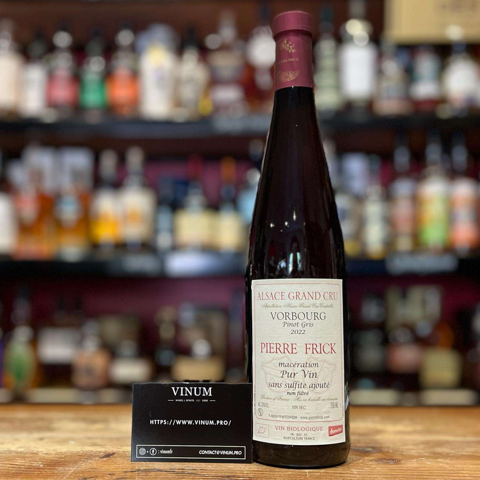 Ce vin est élaboré à 100 % à partir de Pinot Gris issu du Grand Cru Vorbourg, sur des sols marno‑calcaires recouverts de galets et de loess, exposés sud‑sud‑est au‑dessus de Rouffach. La vendange est manuelle, suivie d’une macération de six à sept jours avec les peaux, fermentationTroisième étape de l'élaboration des single malts, elle consiste à transformer les sucres contenus dans le wort en alcool par ajout de levures. La fermentation s'effectue dans d'immenses cuves appelées washbacks. Traditionnellement en pin d'Orégon ou en bois de mélèze, elles sont désormais le plus souvent en acier inoxydable, plus facile d'entretien. Sous l'effet des levures, le moût désormais appelé wash commence à bouillonner. Les washbacks sont équipées d'agitateurs qui permettent de brasser le wash en permanence afin d'empêcher une montée en température trop importante. More naturelle sans levuresMicro-organismes unicellulaires grâce auxquels le jus de raisin devient du vin subissant la fermentation alcoolique. More exogènes, puis élevage de dix mois en vieux foudres. Aucun soufre n’est ajouté, et le vin est mis en bouteille sans collageProcédé de clarification du vin par adjonction d'une substance protéique ou minérale afin d'éliminer les particules en suspension. More ni filtrationLe filtrage, qui précède la mise en bouteilles, consiste à filtrer le whisky à travers une succession de filtres en cellulose. Celui-ci, qui s'effectue généralement à froid (entre 0°C et -10°C), permet d'éliminer certaines matières grasses (riches en arômes) et des résidus de fûts. Il apporte également brillance et limpidité au whisky. L'absence de filtrage à froid permet d'obtenir des whiskies généralement plus gras et plus complexes. Ces derniers peuvent se troubler en dessous de la température de mise en bouteilles. More.